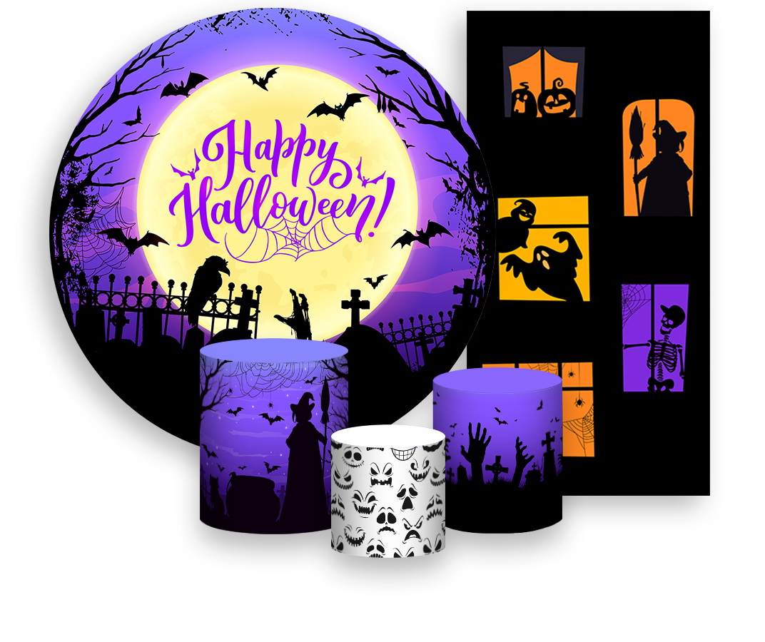 Painel De Festa + Trio De Capas Cilindro + Faixa Veste Fácil - Halloween Luar no Cemitério 016