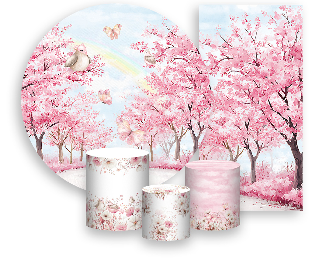 Painel De Festa + Trio De Capas Cilindro + Faixa Veste Fácil - Jardim de Pássaros e Borboletas Rosa 034