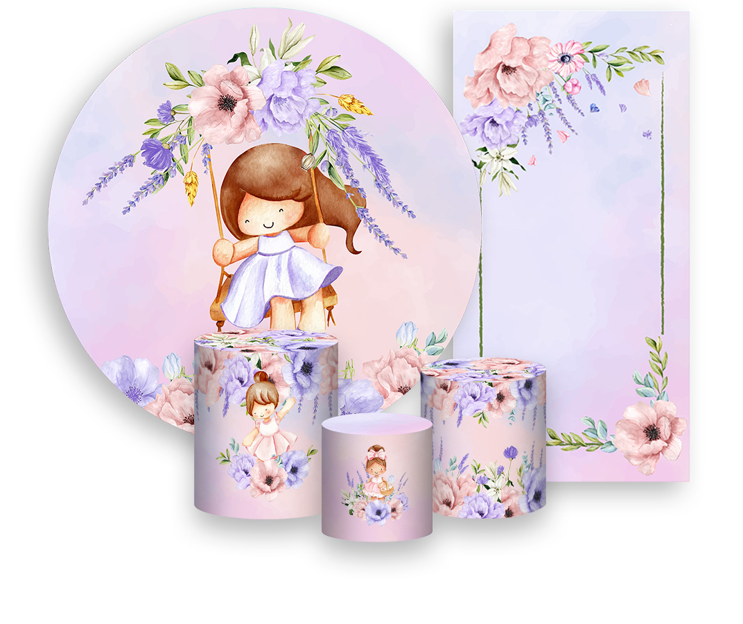 Painel De Festa + Trio De Capas Cilindro + Faixa Veste Fácil - Jardim Rosa e Lilás com Boneca Morena 007