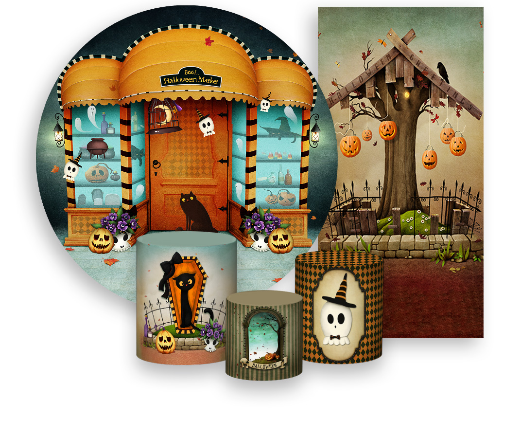 Painel De Festa + Trio De Capas Cilindro + Faixa Veste Fácil - Loja de Halloween Escura 009
