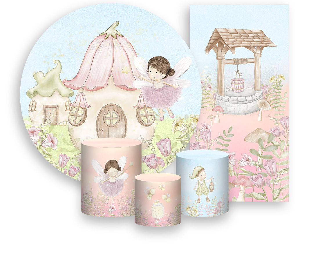 Painel De Festa + Trio De Capas Cilindro + Faixa Veste Fácil - Mundo das Fadas Morena 009