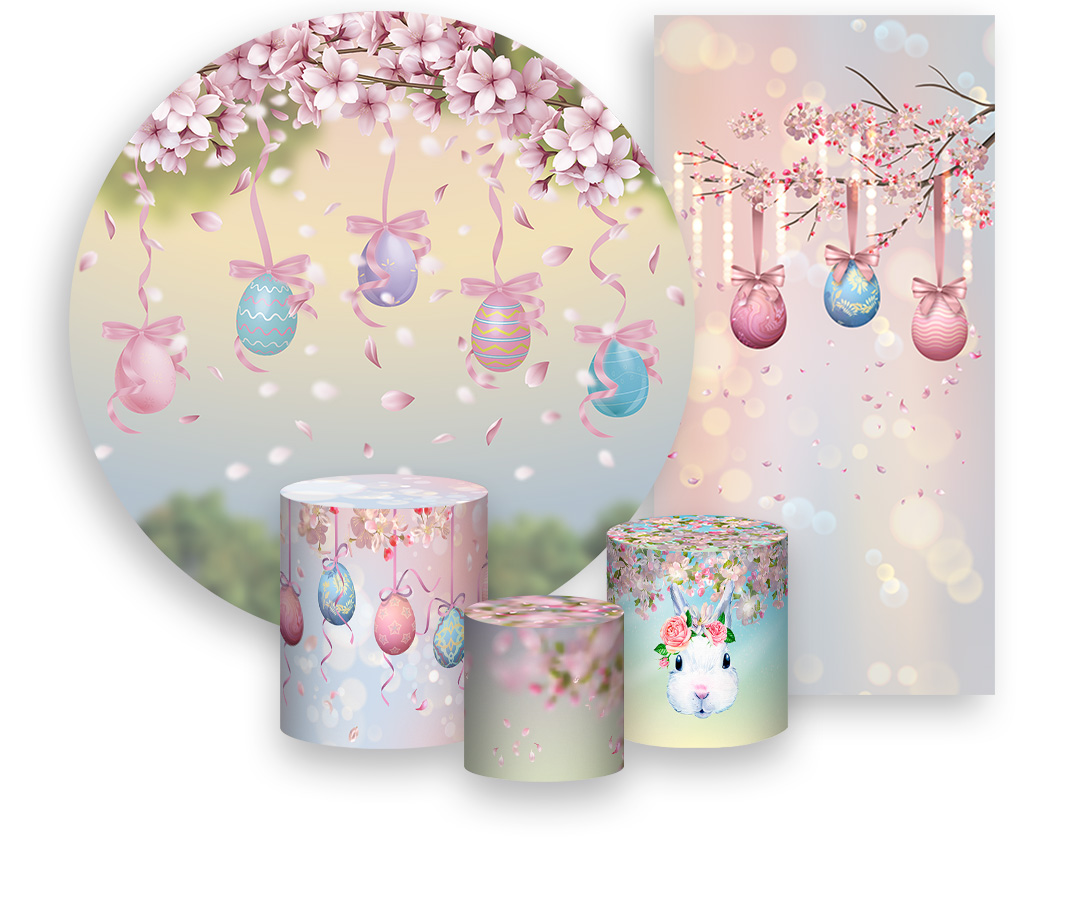 Painel De Festa + Trio De Capas Cilindro + Faixa Veste Fácil - Ovos de Páscoa Flores e Fitas 004