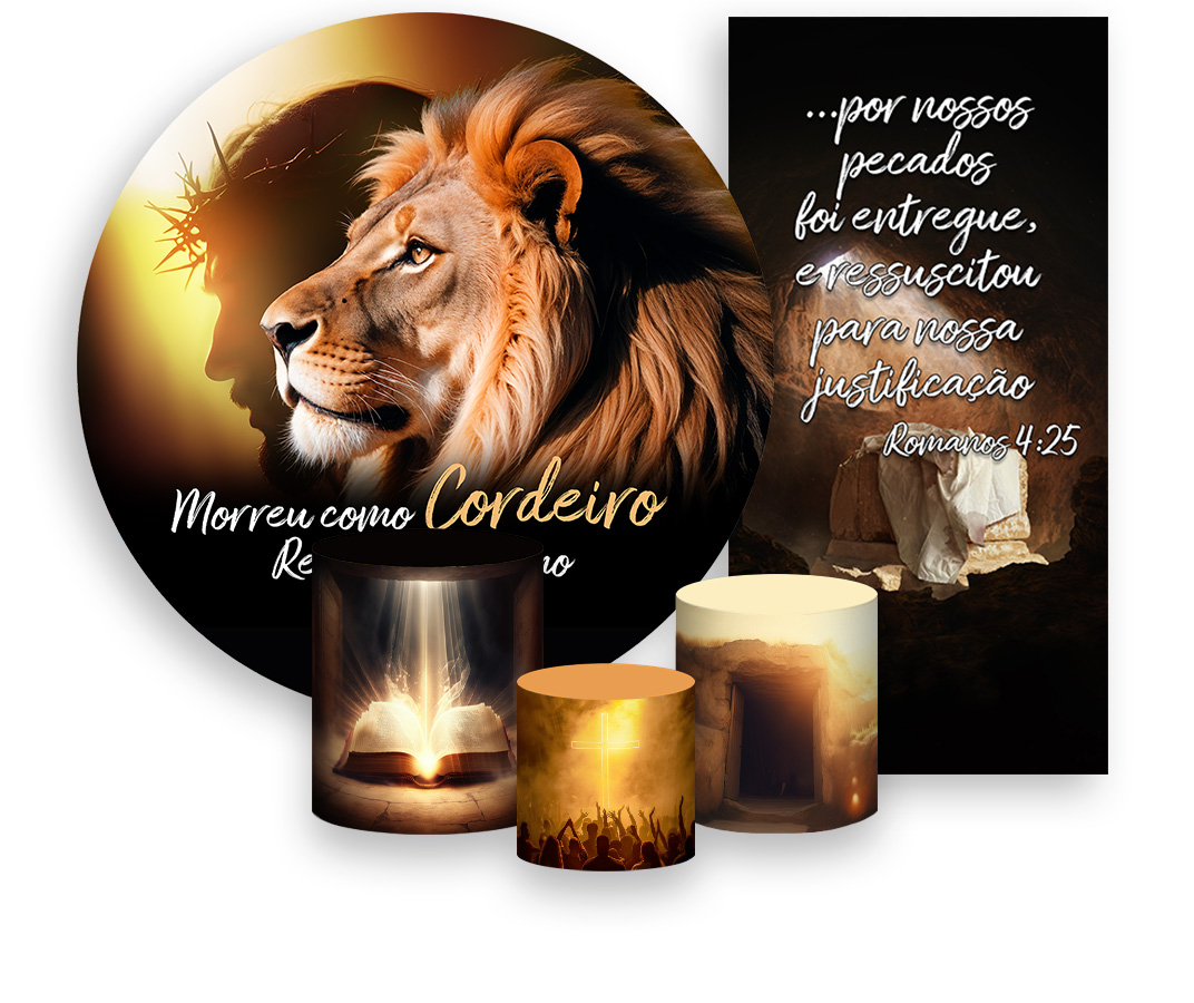 Painel De Festa + Trio De Capas Cilindro + Faixa Veste Fácil - Religioso Ressuscitou como Leão 018