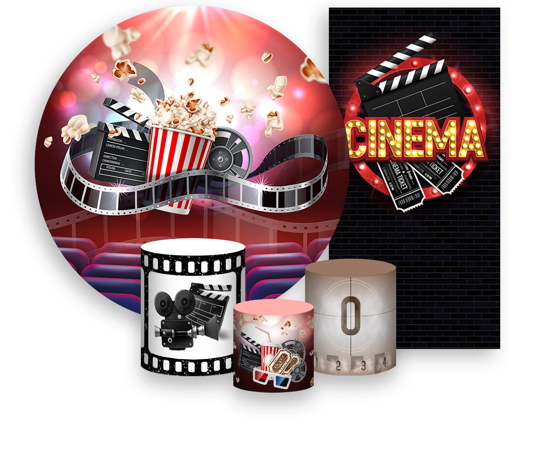 Painel De Festa + Trio De Capas Cilindro + Faixa Veste Fácil - Sala de Cinema Pipoca Claquete 001
