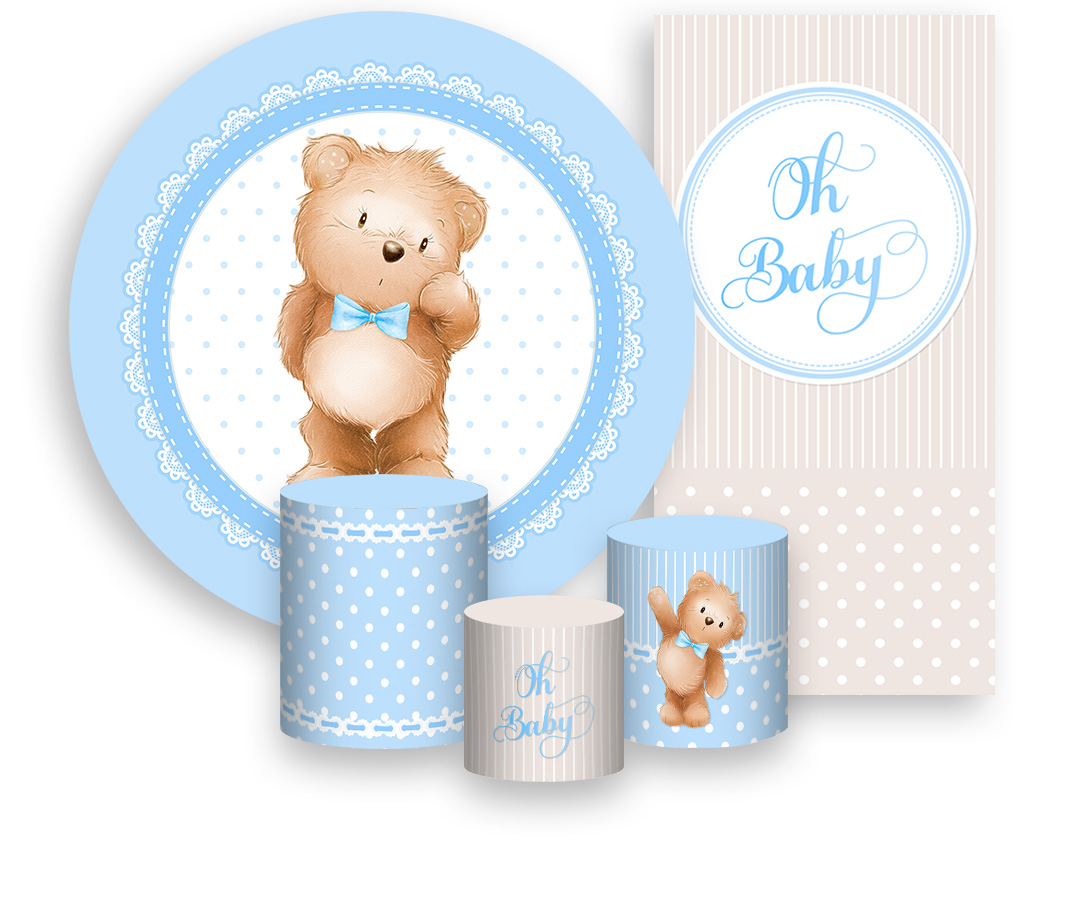 Painel De Festa + Trio De Capas Cilindro + Faixa Veste Fácil - Ursinho Azul Oh Baby 012