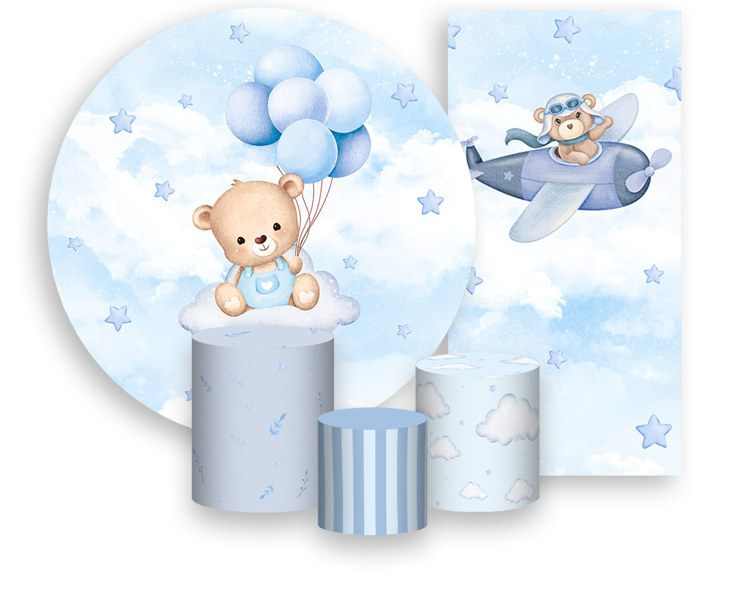 Painel De Festa + Trio De Capas Cilindro + Faixa Veste Fácil - Ursinho de Pelúcia Azul 035