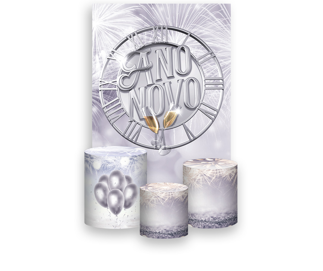 Painel De Festa Vertical 1,50 x 2,20 + Trio De Capas Cilindro - Ano Novo Prateado 010