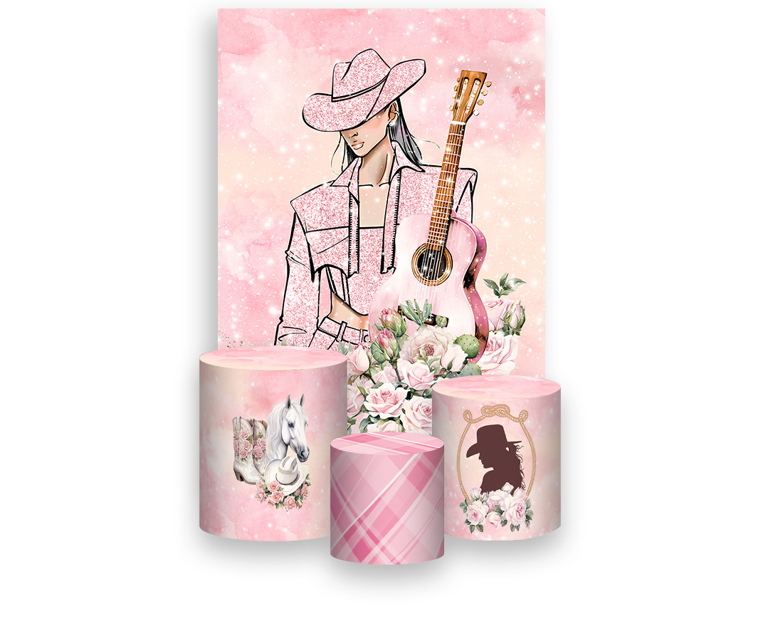 Painel De Festa Vertical 1,50 x 2,20 + Trio De Capas Cilindro - Boiadeira Rosa Roupas Efeito Brilho 046