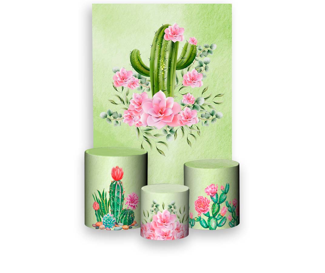 Painel De Festa Vertical 1,50 x 2,20 + Trio De Capas Cilindro - Cactos e Flores 005