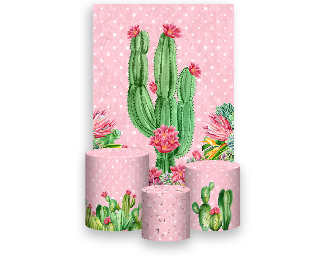 Painel De Festa Vertical 1,50 x 2,20 + Trio De Capas Cilindro - Cactos e Flores Rosas 126