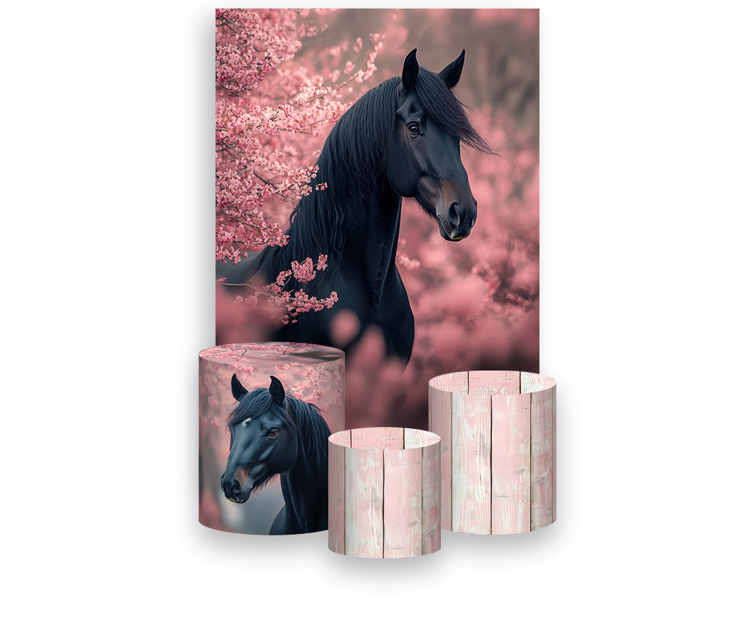 Painel De Festa Vertical 1,50 x 2,20 + Trio De Capas Cilindro - Cavalo Árvores Cerejeira 053
