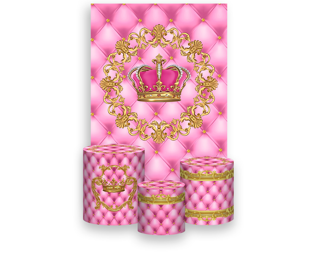 Painel De Festa Vertical 1,50 x 2,20 + Trio De Capas Cilindro - Coroa Realeza Capitonê Rosa 018