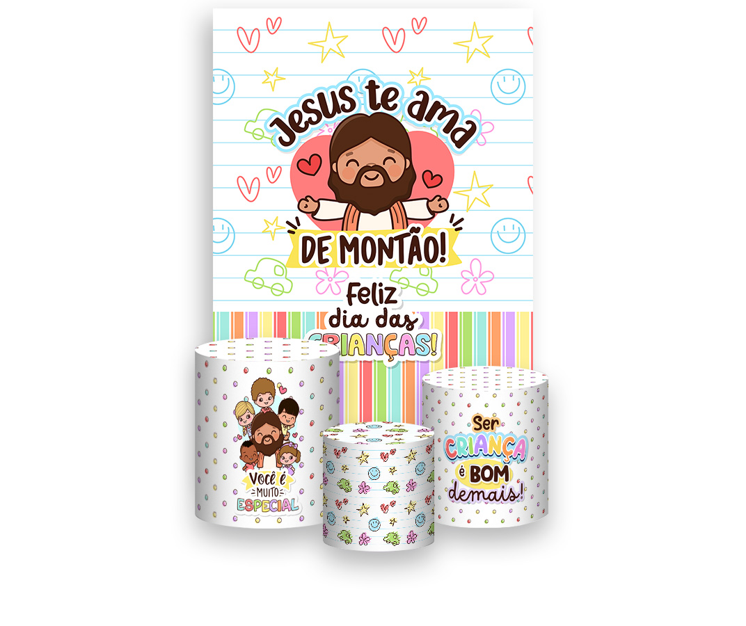 Painel De Festa Vertical 1,50 x 2,20 + Trio De Capas Cilindro - Dia das Crianças Jesus Te Ama 040