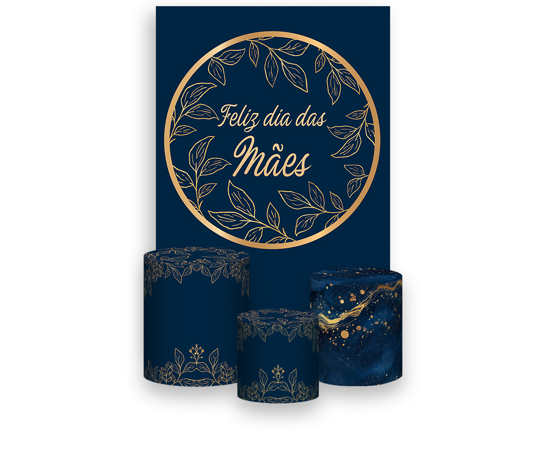 Painel De Festa Vertical 1,50 x 2,20 + Trio De Capas Cilindro - Dia das Mães Azul Marinho e Dourado 113