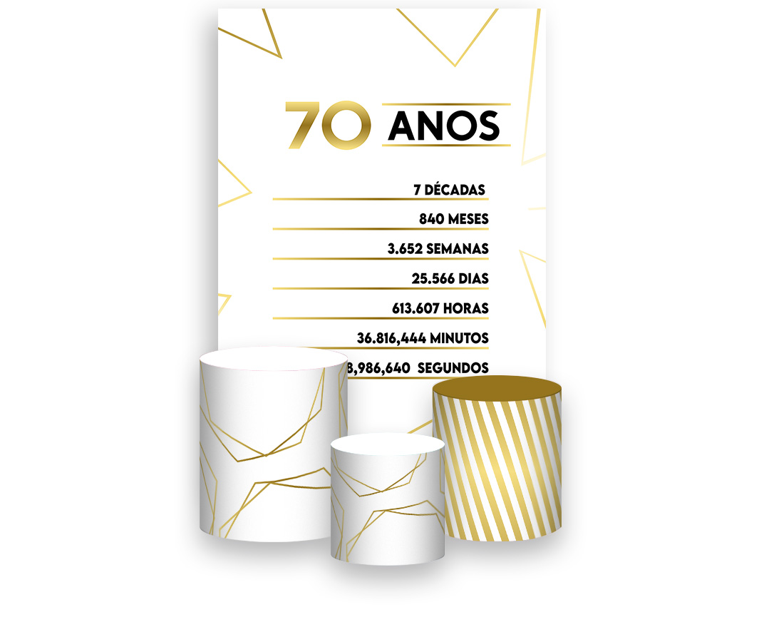 Painel De Festa Vertical 1,50 x 2,20 + Trio De Capas Cilindro - Efeito Geométrico Dourado 70 Anos 087