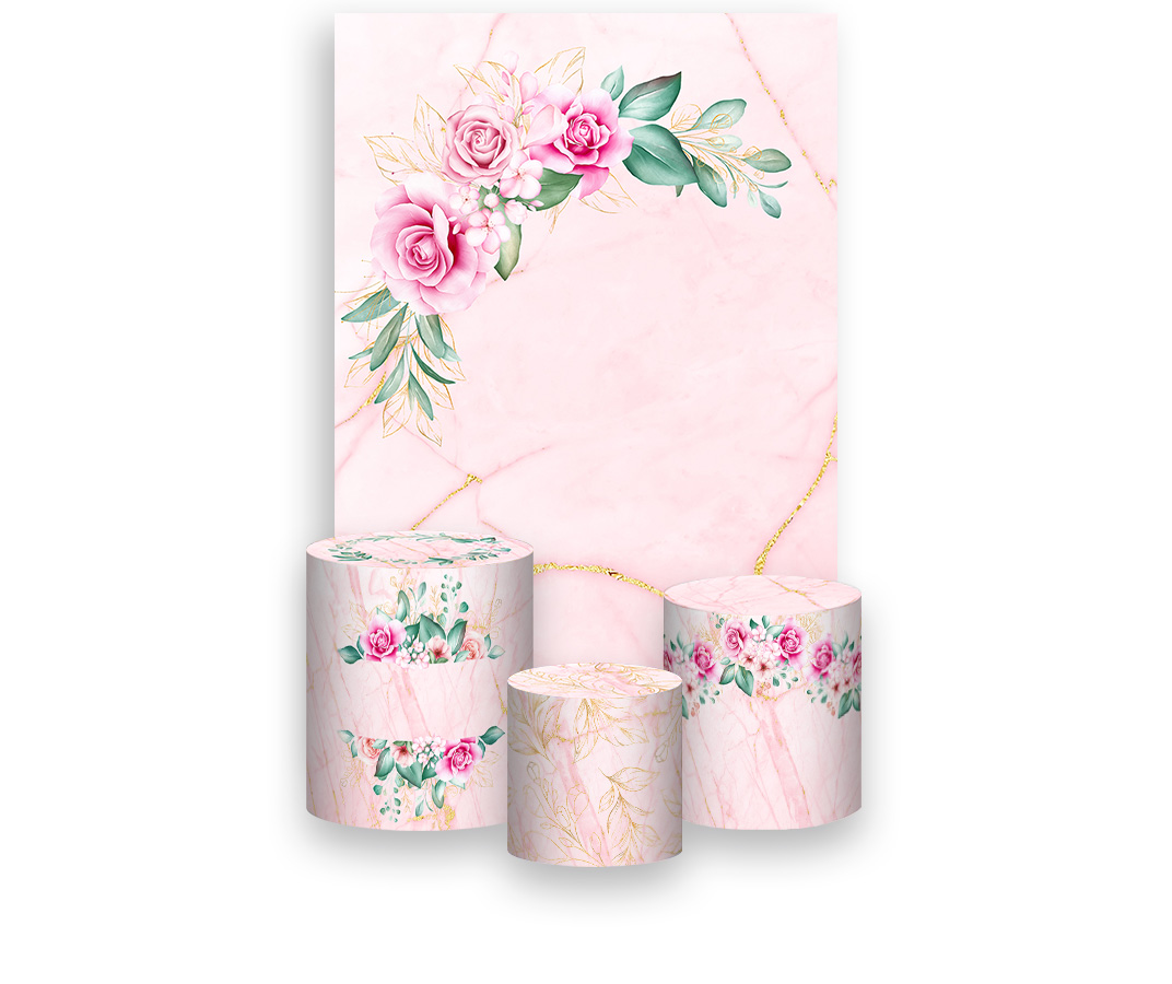 Painel De Festa Vertical 1,50 x 2,20 + Trio De Capas Cilindro - Efeito Mármore Rosa com Dourado 067
