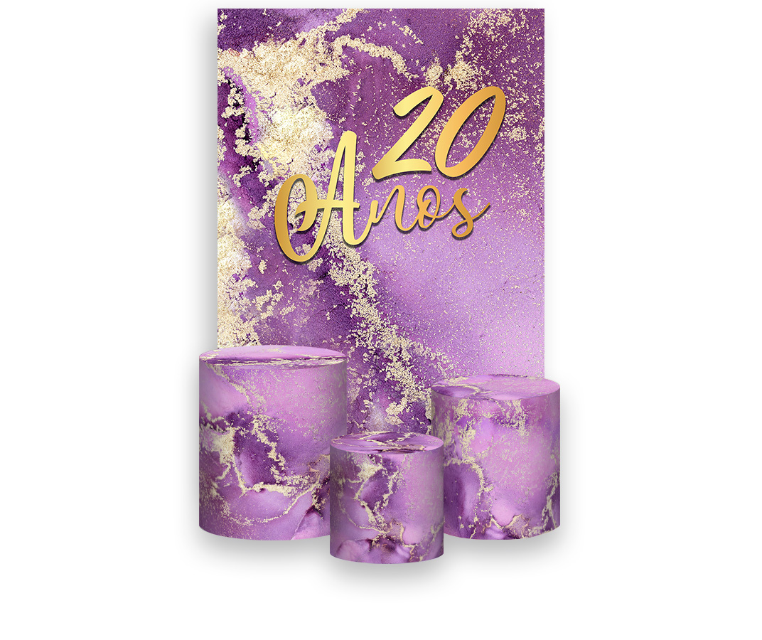 Painel De Festa Vertical 1,50 x 2,20 + Trio De Capas Cilindro - Efeito Mármore Roxo com Dourado 20 Anos 064