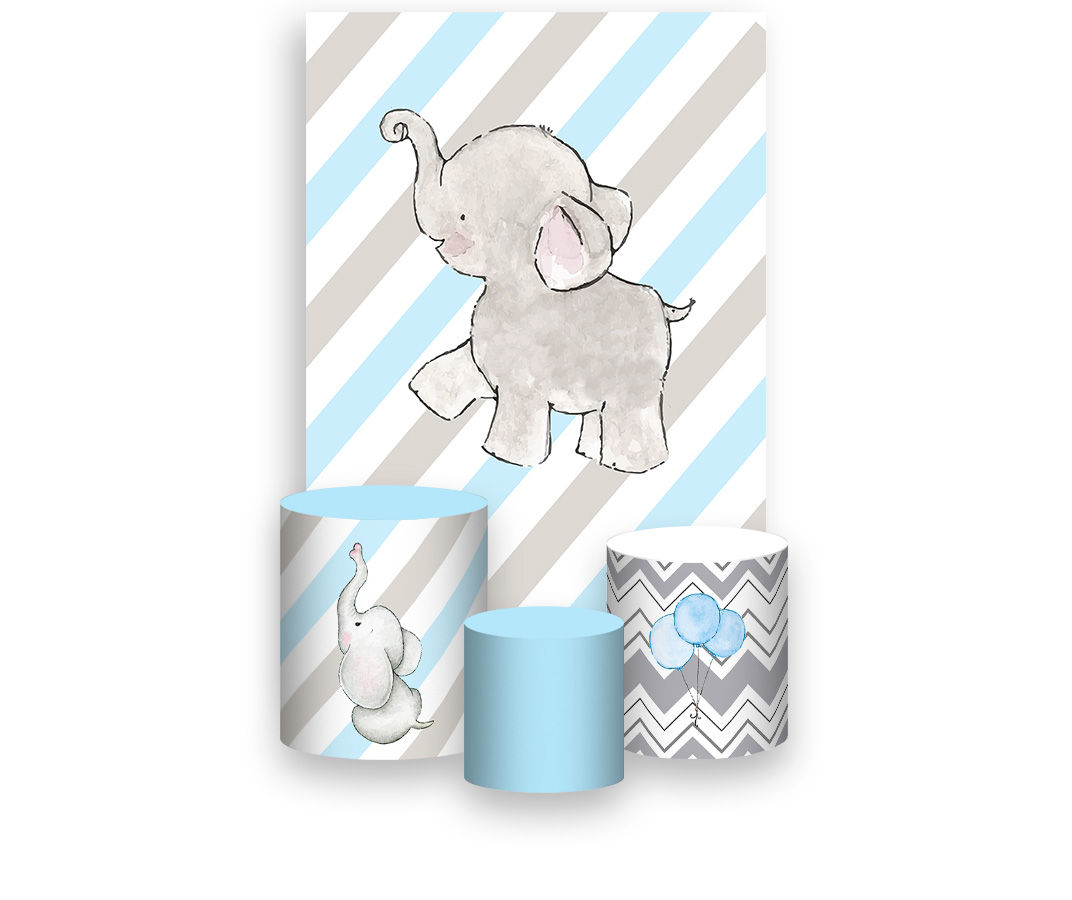 Painel De Festa Vertical 1,50 x 2,20 + Trio De Capas Cilindro - Elefante Cute Azul 048