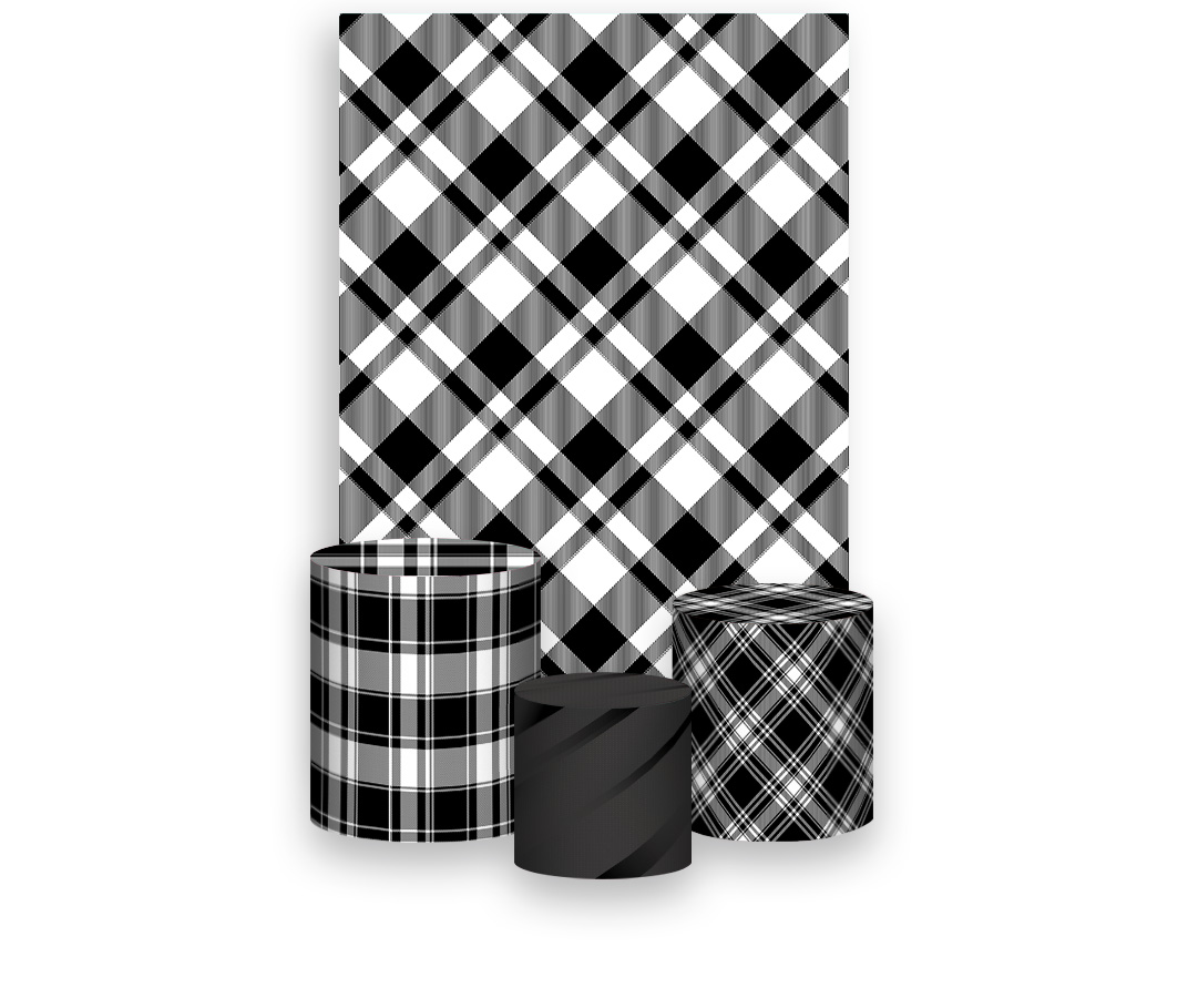 Painel De Festa Vertical 1,50 x 2,20 + Trio De Capas Cilindro - Estampa Xadrez Preto e Branco 001