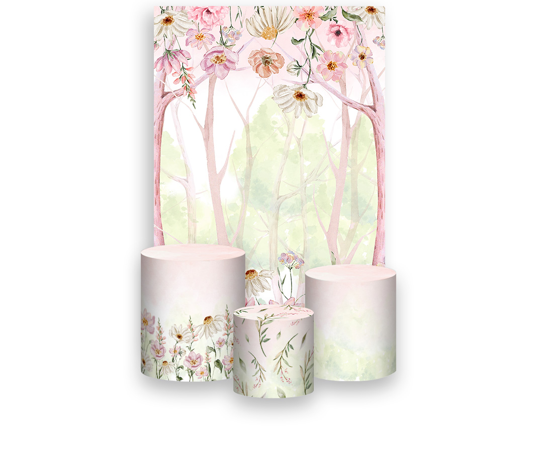 Painel De Festa Vertical 1,50 x 2,20 + Trio De Capas Cilindro - Floresta Rosada Aquarela 109