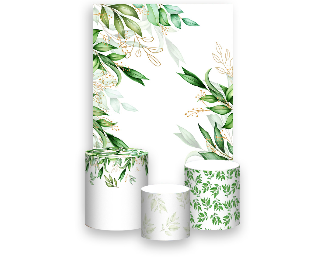 Painel De Festa Vertical 1,50 x 2,20 + Trio De Capas Cilindro - Folhagens Verdes 099