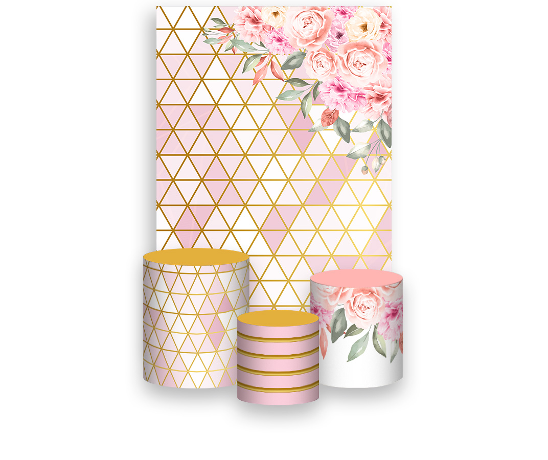 Painel De Festa Vertical 1,50 x 2,20 + Trio De Capas Cilindro - Geométrico Floral Rosa e Dourado 043