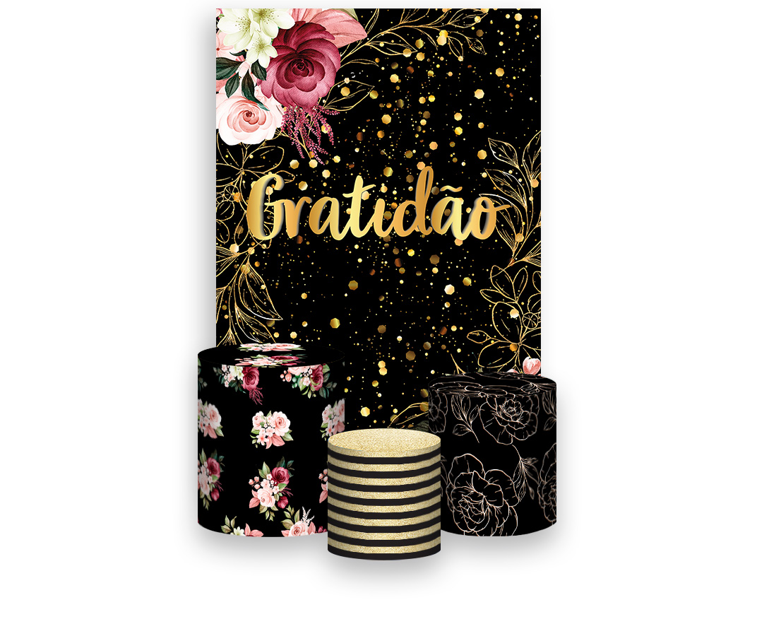 Painel De Festa Vertical 1,50 x 2,20 + Trio De Capas Cilindro - Gratidão Floral Efeito Brilhos 240