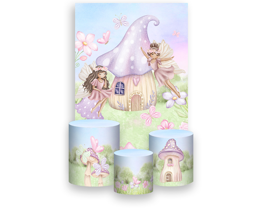 Painel De Festa Vertical 1,50 x 2,20 + Trio De Capas Cilindro - Jardim das Fadas Aquarela 011