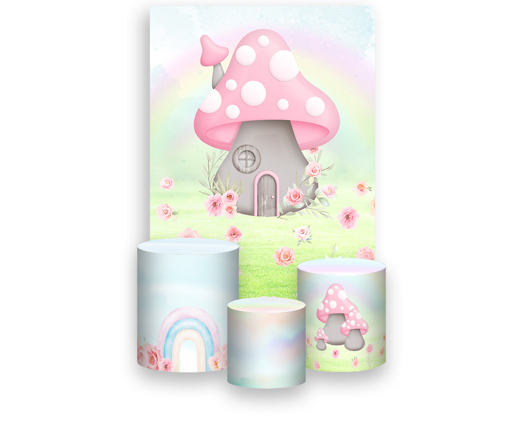 Painel De Festa Vertical 1,50 x 2,20 + Trio De Capas Cilindro - Jardim de Cogumelos em Tons Pastéis 062