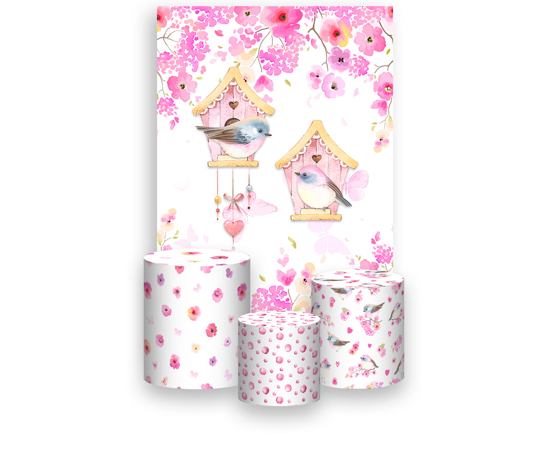 Painel De Festa Vertical 1,50 x 2,20 + Trio De Capas Cilindro - Jardim de Passarinhos e Flores 008