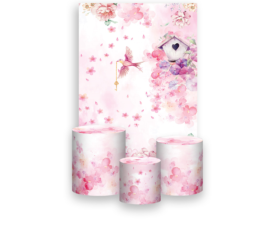 Painel De Festa Vertical 1,50 x 2,20 + Trio De Capas Cilindro - Jardim Passarinhos Rosa Menina 011