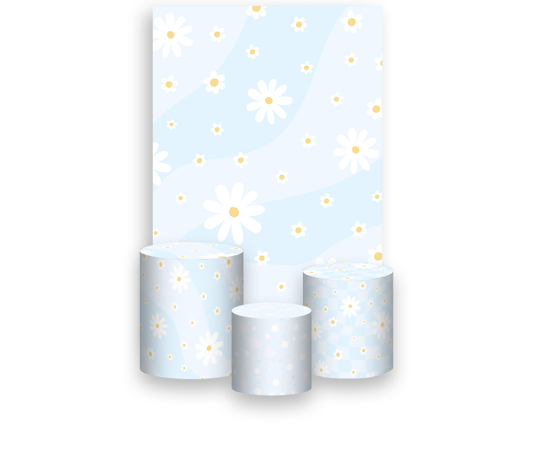 Painel De Festa Vertical 1,50 x 2,20 + Trio De Capas Cilindro - Margaridas Fundo Azul Suave 041