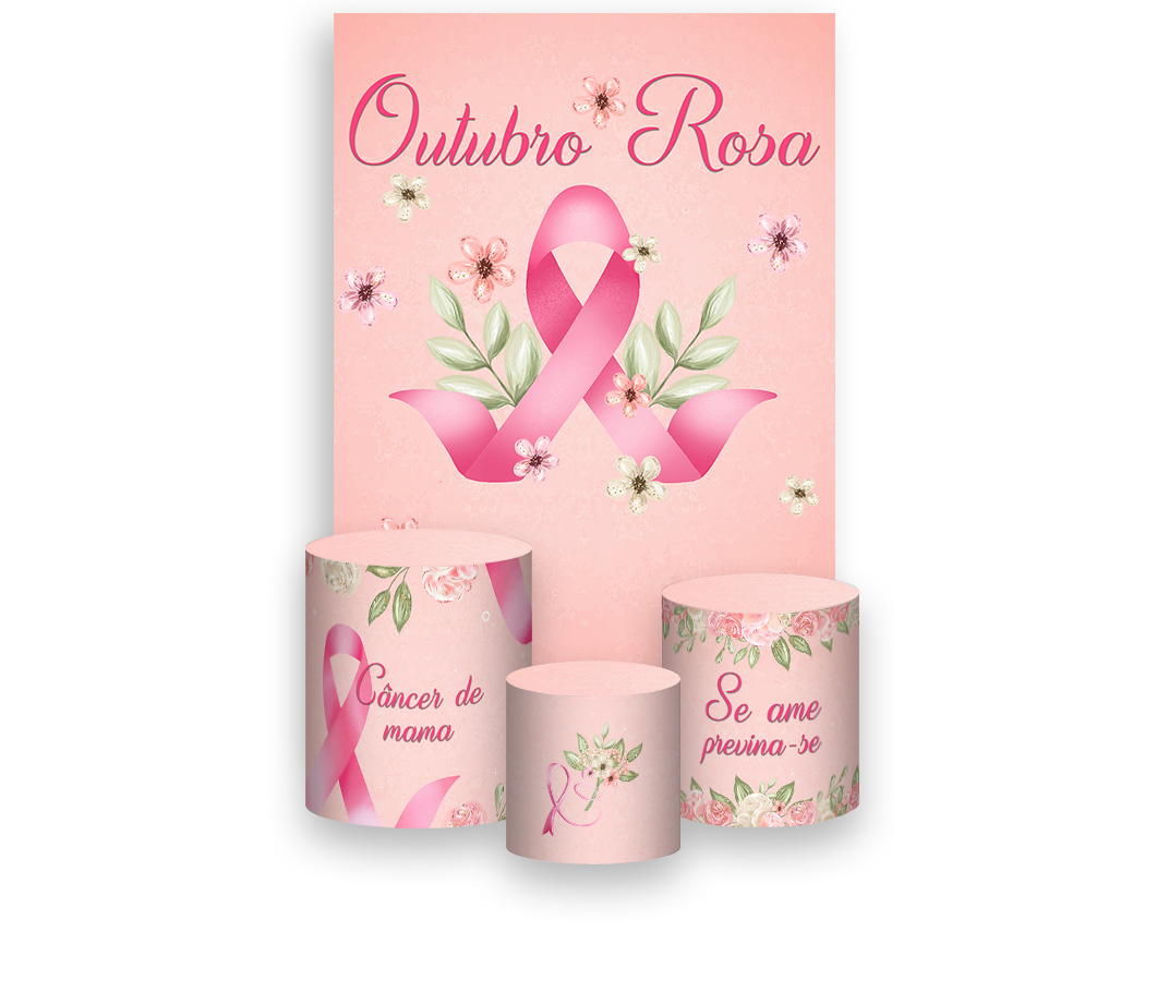 Painel De Festa Vertical 1,50 x 2,20 + Trio De Capas Cilindro - Outubro Rosa Flores Aquarela 016