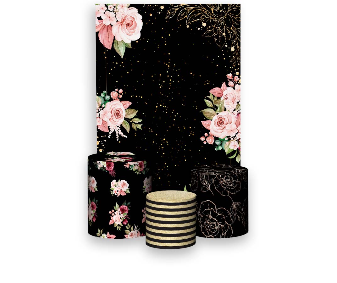 Painel De Festa Vertical 1,50 x 2,20 + Trio De Capas Cilindro - Preto com Flores Rosas 011