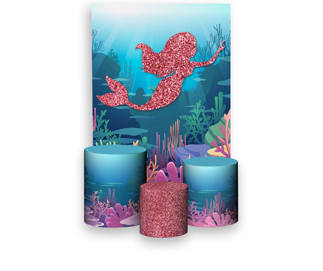 Painel De Festa Vertical 1,50 x 2,20 + Trio De Capas Cilindro - Sereia fundo do Mar Rosa 004