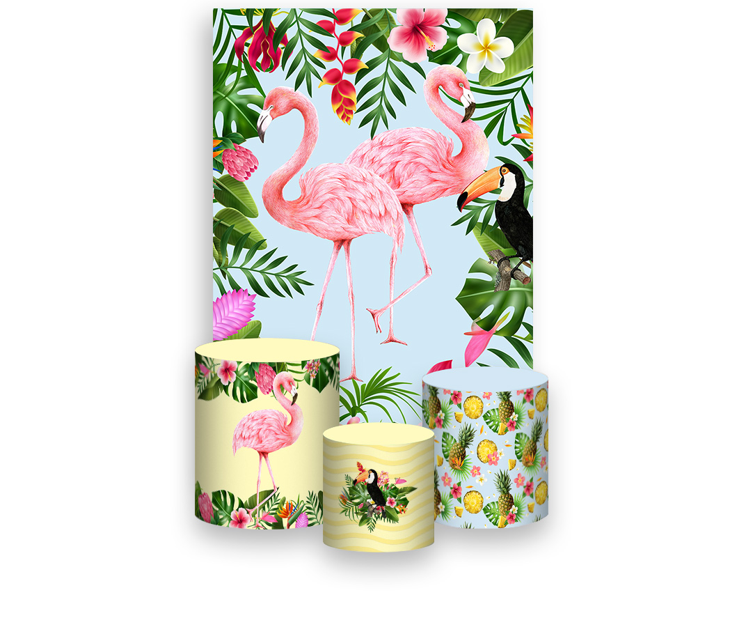 Painel De Festa Vertical 1,50 x 2,20 + Trio De Capas Cilindro - Tropical Flamingos Folhagens 021