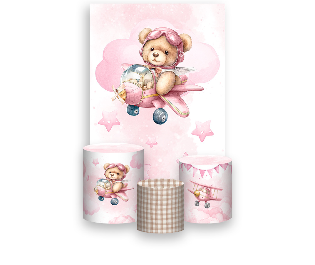 Painel De Festa Vertical 1,50 x 2,20 + Trio De Capas Cilindro - Ursinha Aviadora Nuvens Rosas 114
