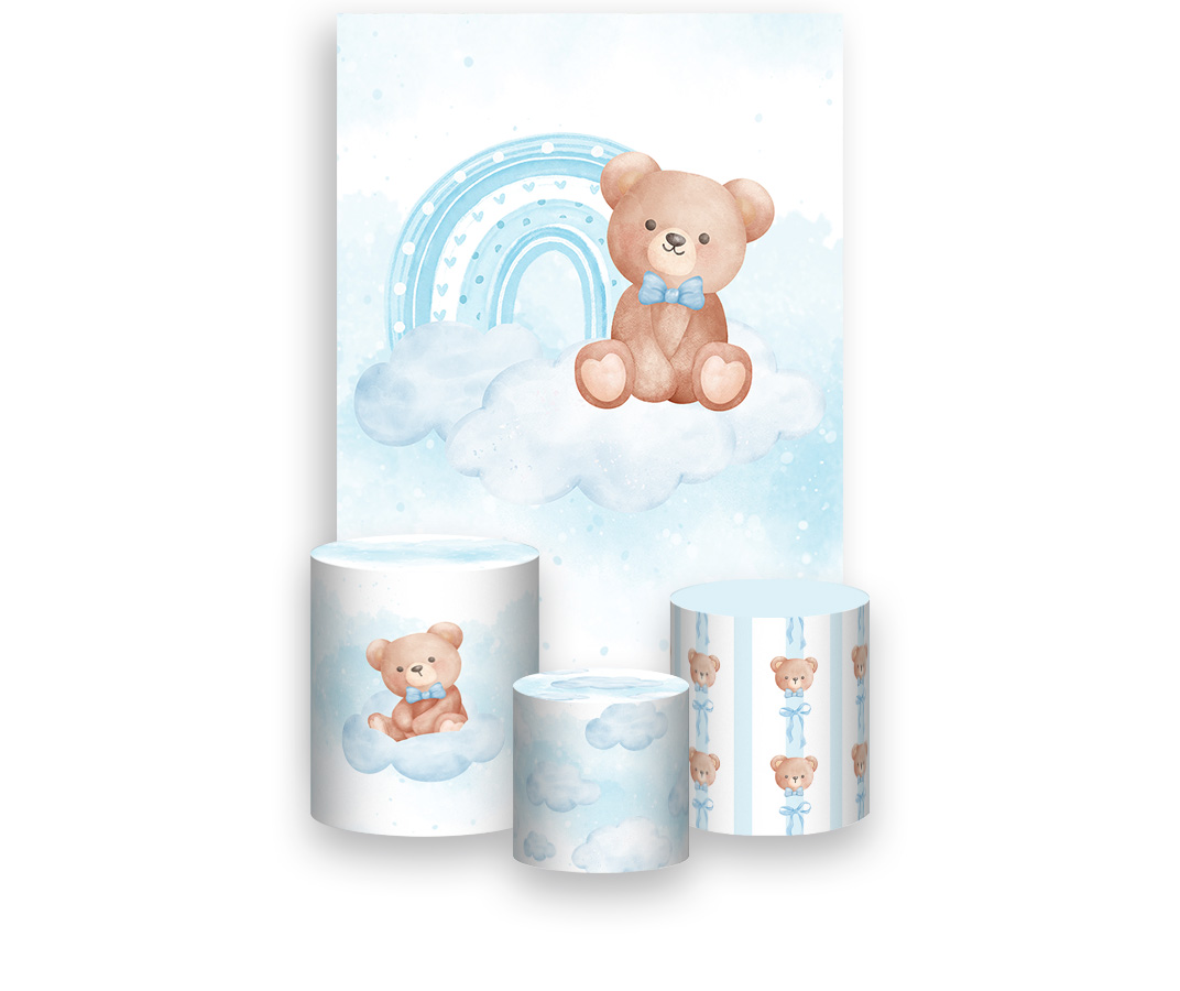 Painel De Festa Vertical 1,50 x 2,20 + Trio De Capas Cilindro - Ursinho Arco-íris Azul 117