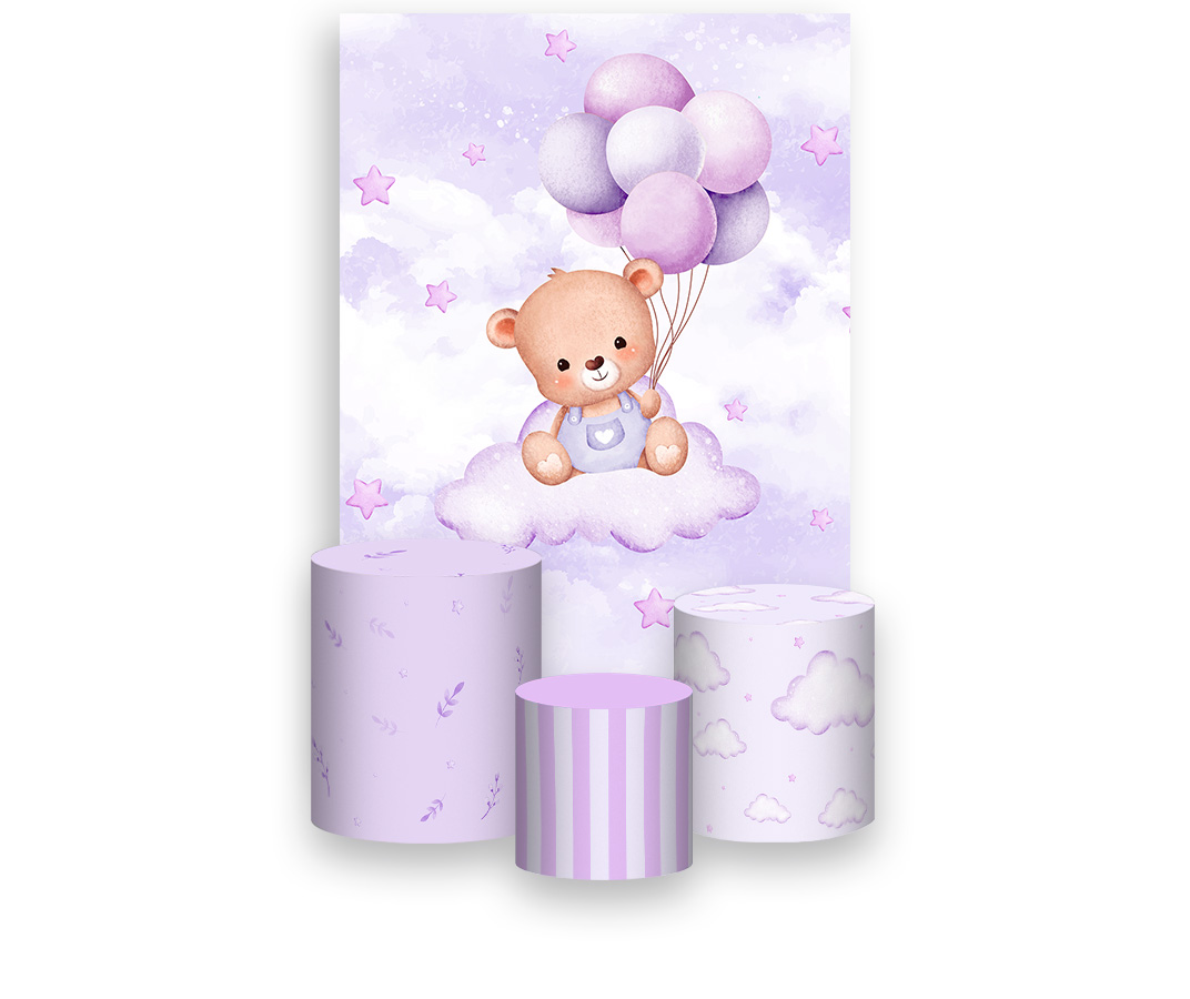 Painel De Festa Vertical 1,50 x 2,20 + Trio De Capas Cilindro - Ursinho de Pelúcia Lilás 104