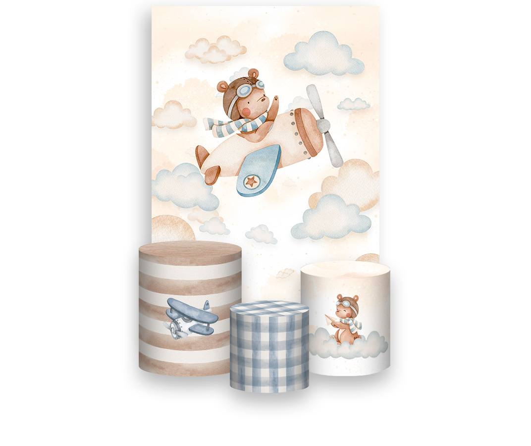 Painel De Festa Vertical 1,50 x 2,20 + Trio De Capas Cilindro - Urso Aviador nas Nuvens Aquarela 099